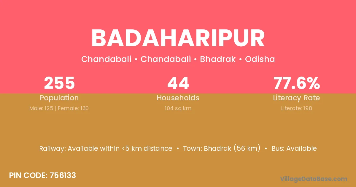 Bhadrak (56 km) is the nearest town to Badaharipur village for major economic activities and is located approximately 56 km away.