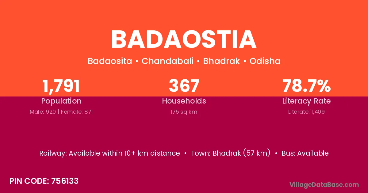 Bhadrak (57 km) is the nearest town to Badaostia village for major economic activities and is located approximately 57 km away.
