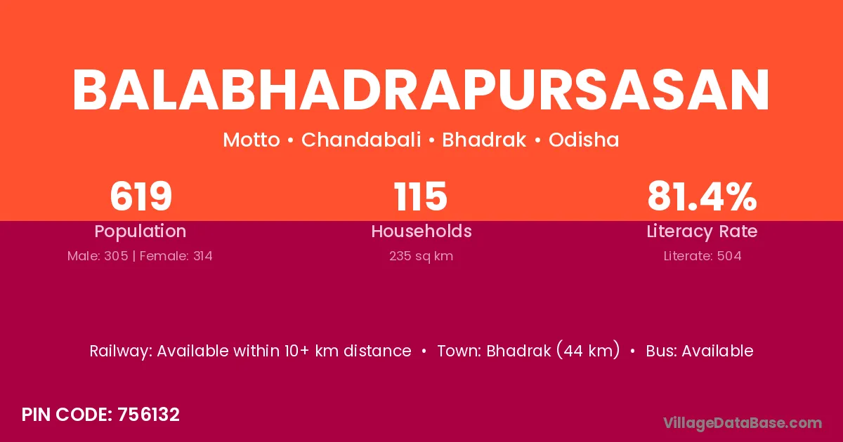 Bhadrak (44 km) is the nearest town to Balabhadrapursasan village for major economic activities and is located approximately 44 km away.