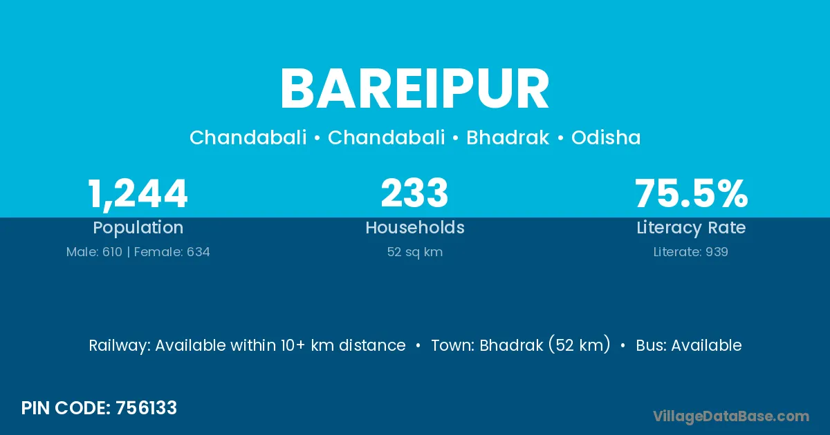 Bhadrak (52 km) is the nearest town to Bareipur village for major economic activities and is located approximately 52 km away.