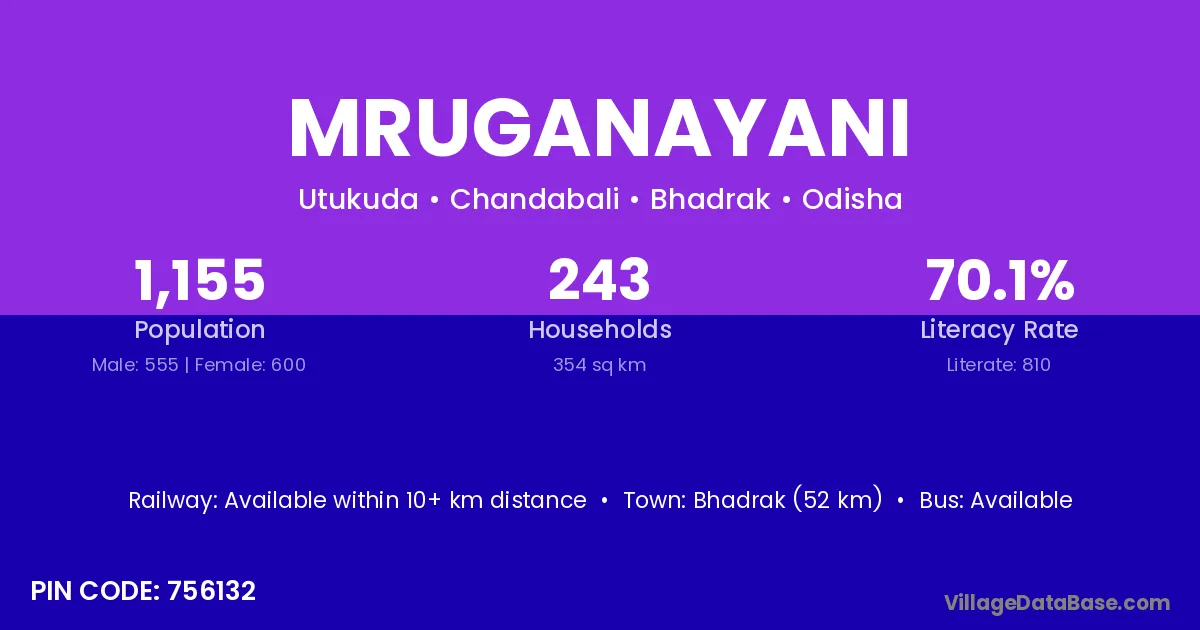 Bhadrak (52 km) is the nearest town to Mruganayani village for major economic activities and is located approximately 52 km away.