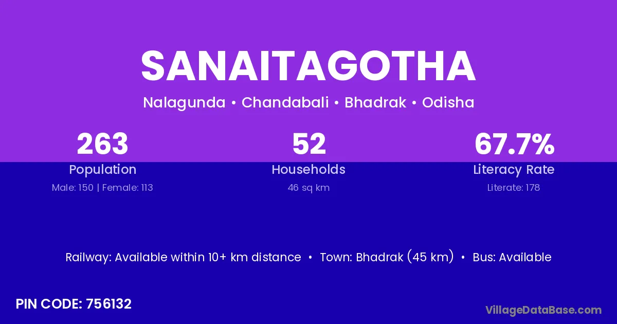 Bhadrak (45 km) is the nearest town to Sanaitagotha village for major economic activities and is located approximately 45 km away.