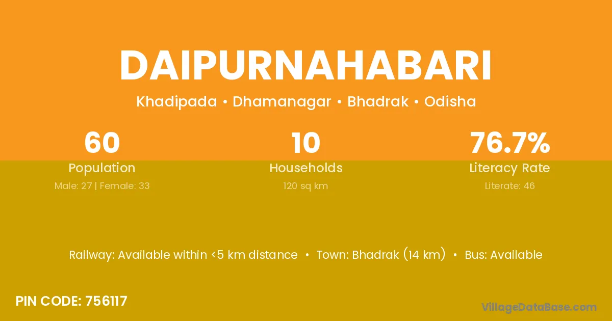 Bhadrak (14 km) is the nearest town to Daipurnahabari village for major economic activities and is located approximately 14 km away.