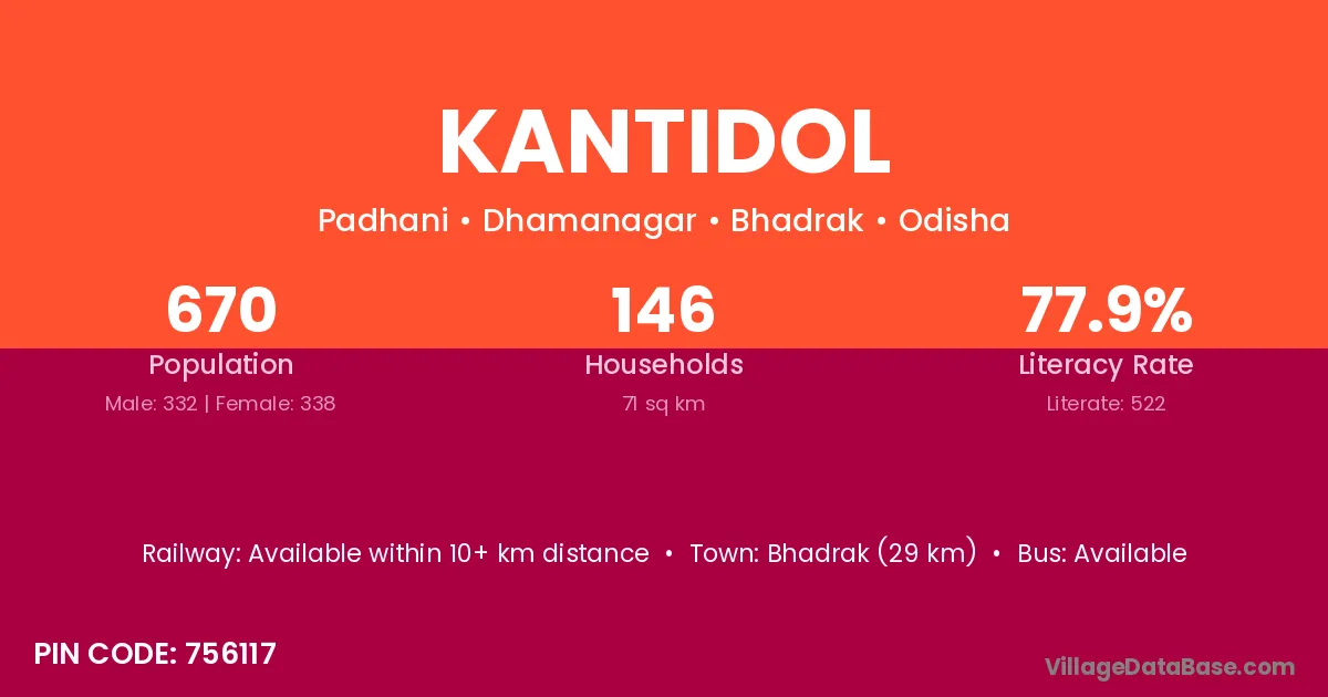 Bhadrak (29 km) is the nearest town to Kantidol village for major economic activities and is located approximately 29 km away.
