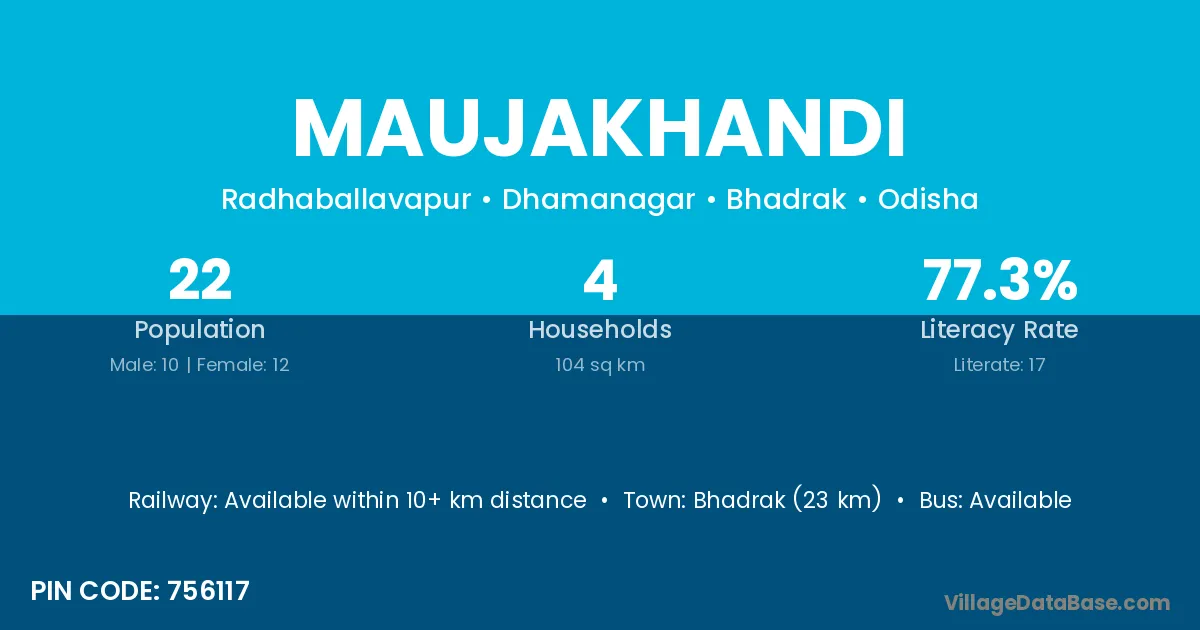 Bhadrak (23 km) is the nearest town to Maujakhandi village for major economic activities and is located approximately 23 km away.