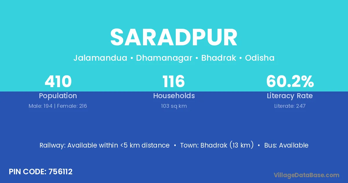 Bhadrak (13 km) is the nearest town to Saradpur village for major economic activities and is located approximately 13 km away.