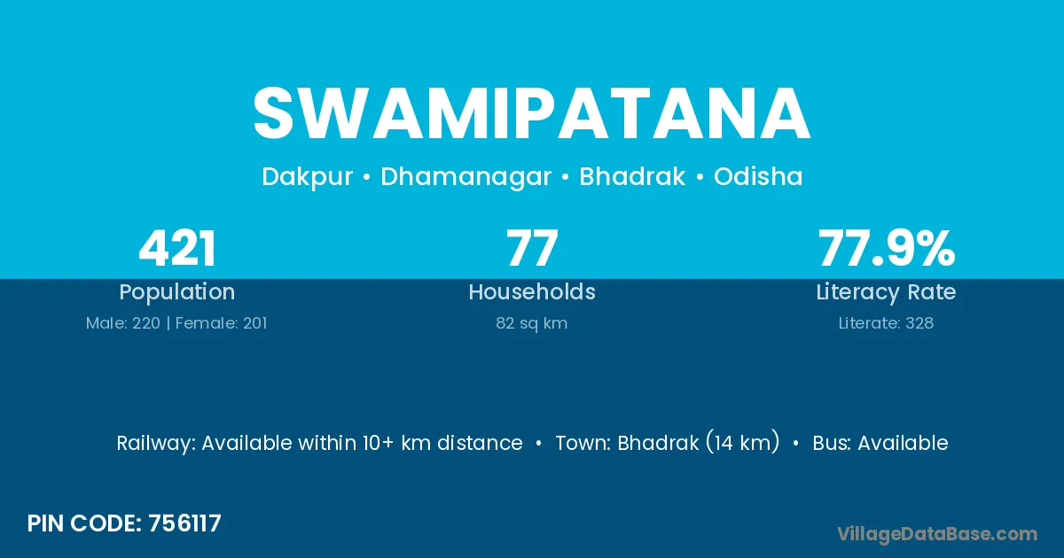 Bhadrak (14 km) is the nearest town to Swamipatana village for major economic activities and is located approximately 14 km away.