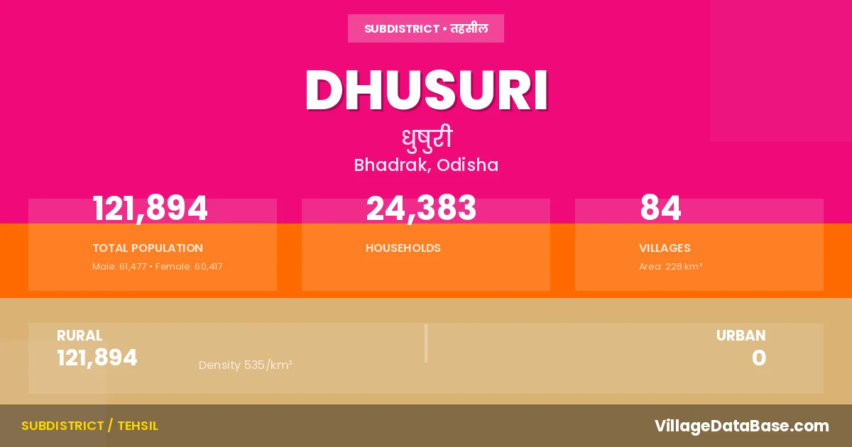 Dhusuri is a town and Tehsil in the Bhadrak district of the Odisha. In India, a Tehsil is a subdivision of a district responsible for the administration and revenue collection of a specific area within the district. Tehsils play a crucial role in the local governance structure, contributing significantly to the development and administration of their communities.