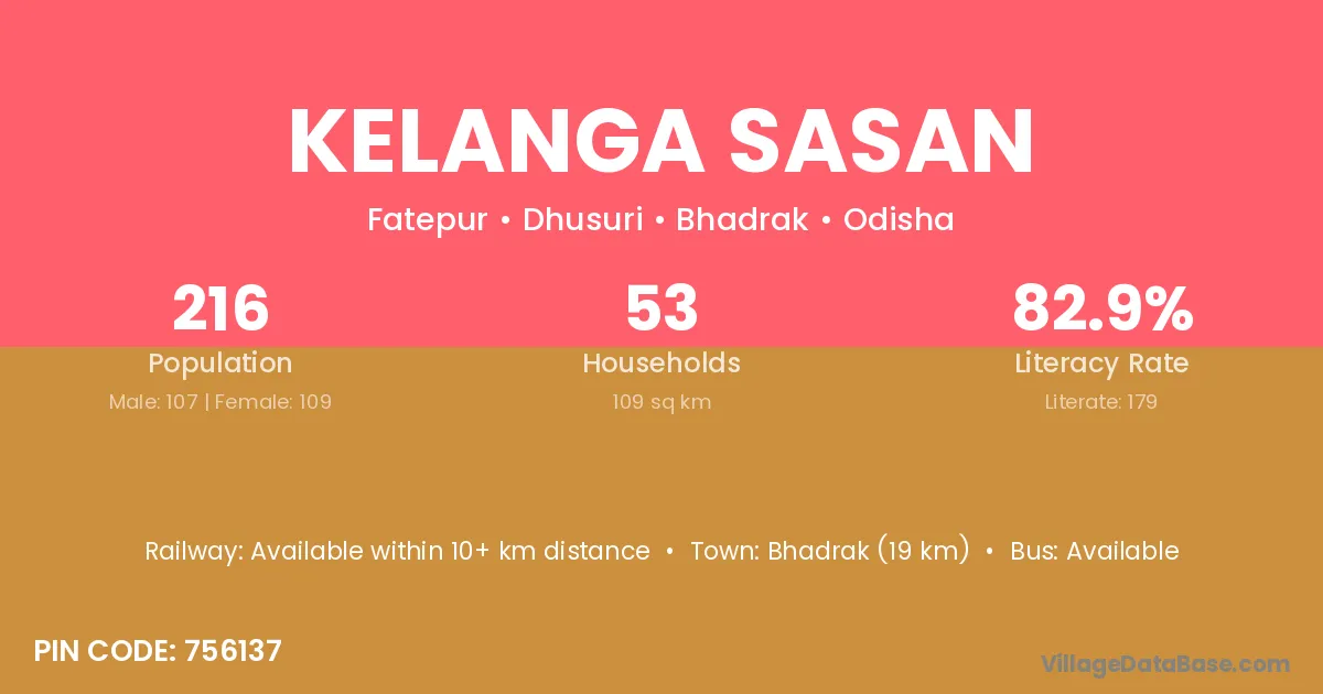 Bhadrak (19 km) is the nearest town to Kelanga Sasan village for major economic activities and is located approximately 19 km away.