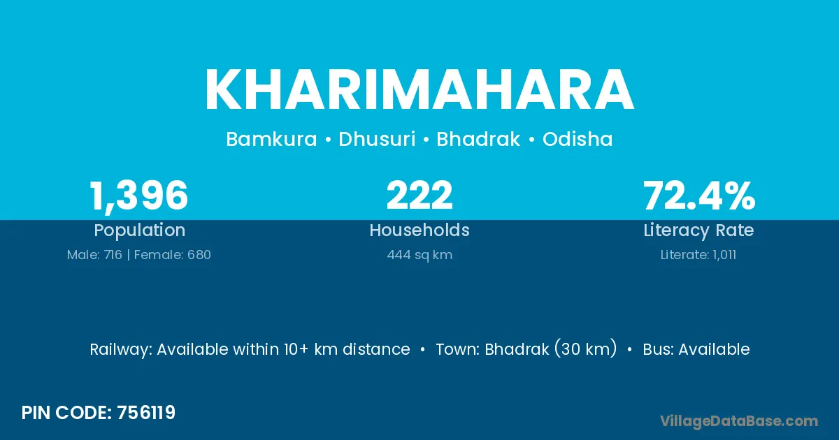 Bhadrak (30 km) is the nearest town to Kharimahara village for major economic activities and is located approximately 30 km away.