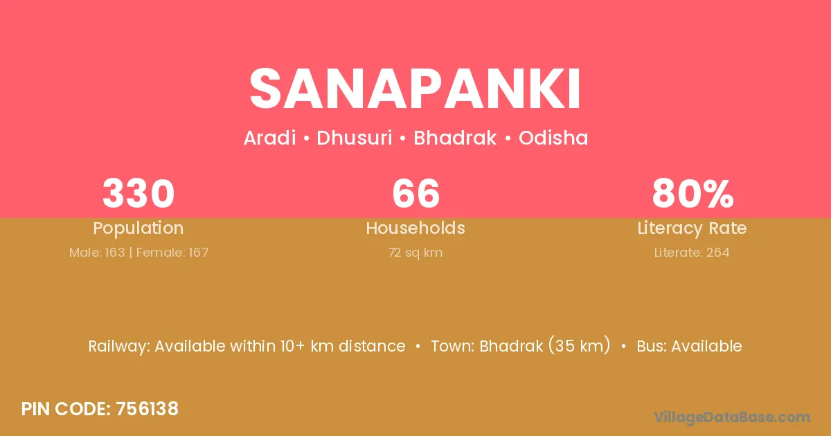 Bhadrak (35 km) is the nearest town to Sanapanki village for major economic activities and is located approximately 35 km away.