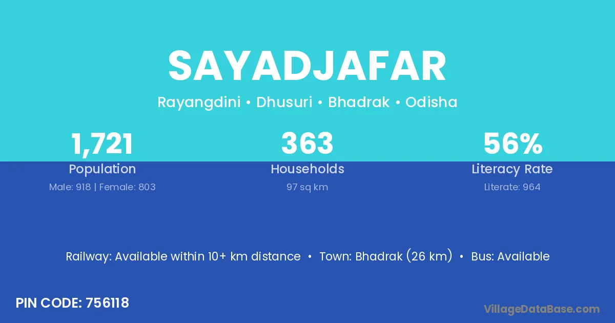 Bhadrak (26 km) is the nearest town to Sayadjafar village for major economic activities and is located approximately 26 km away.