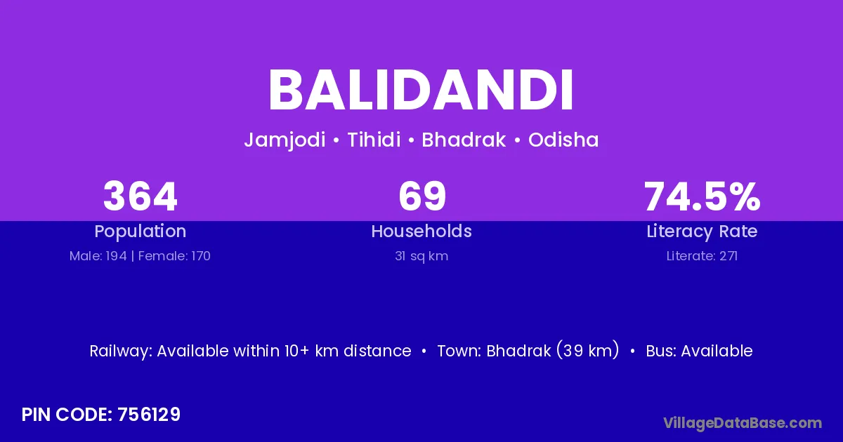 Bhadrak (39 km) is the nearest town to Balidandi village for major economic activities and is located approximately 39 km away.