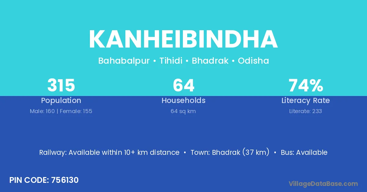 Bhadrak (37 km) is the nearest town to Kanheibindha village for major economic activities and is located approximately 37 km away.