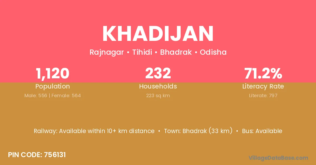 Bhadrak (33 km) is the nearest town to Khadijan village for major economic activities and is located approximately 33 km away.