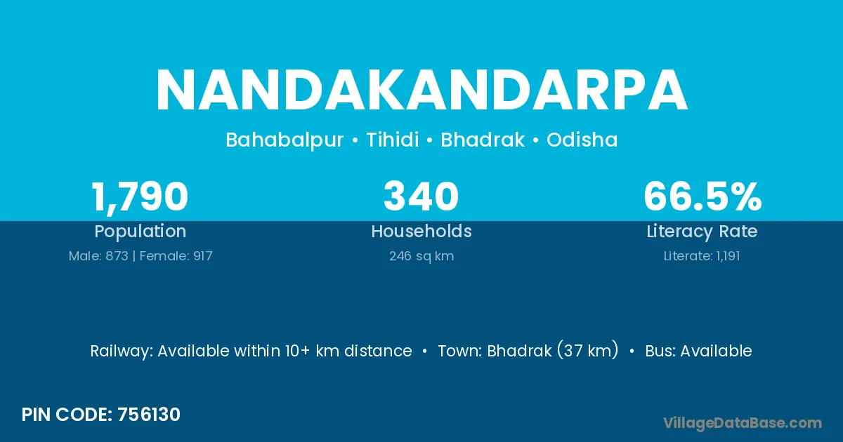 Bhadrak (37 km) is the nearest town to Nandakandarpa village for major economic activities and is located approximately 37 km away.