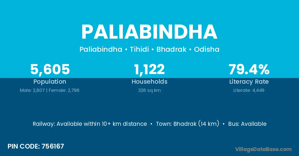 Bhadrak (14 km) is the nearest town to Paliabindha village for major economic activities and is located approximately 14 km away.