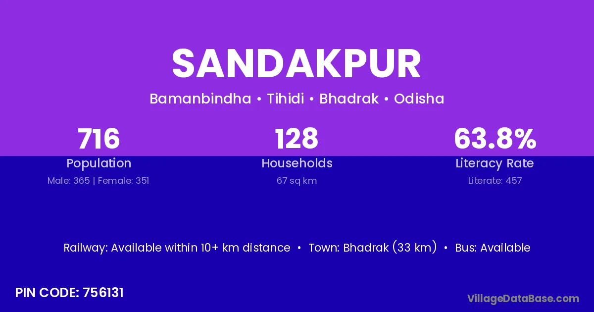 Bhadrak (33 km) is the nearest town to Sandakpur village for major economic activities and is located approximately 33 km away.