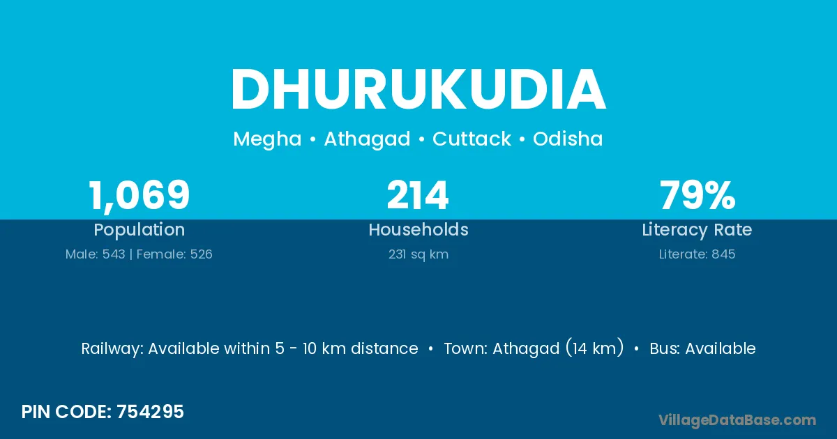 Athagad (14 km) is the nearest town to Dhurukudia village for major economic activities and is located approximately 14 km away.