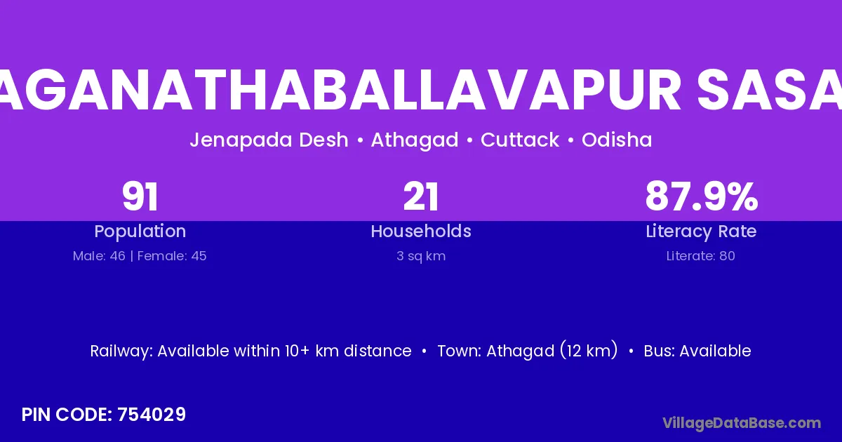 Jaganathaballavapur Sasan village has a total population of 91 people, of which 46 are males and 45 are females.