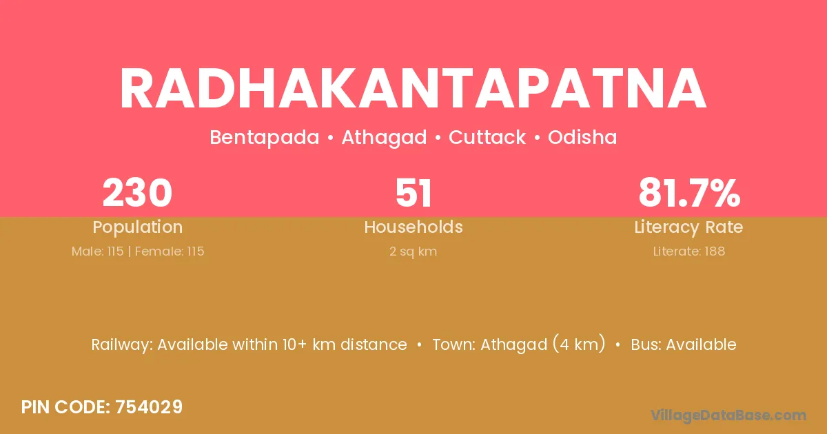 Radhakantapatna village has a total population of 230 people, of which 115 are males and 115 are females.