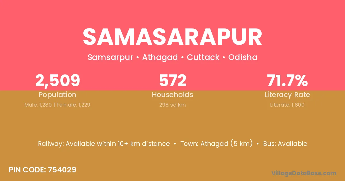 Athagad (5 km) is the nearest town to Samasarapur village for major economic activities and is located approximately 5 km away.