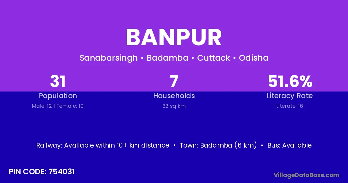Banpur village has a total population of 31 people, of which 12 are males and 19 are females.