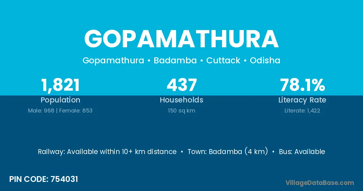 Badamba (4 km) is the nearest town to Gopamathura village for major economic activities and is located approximately 4 km away.