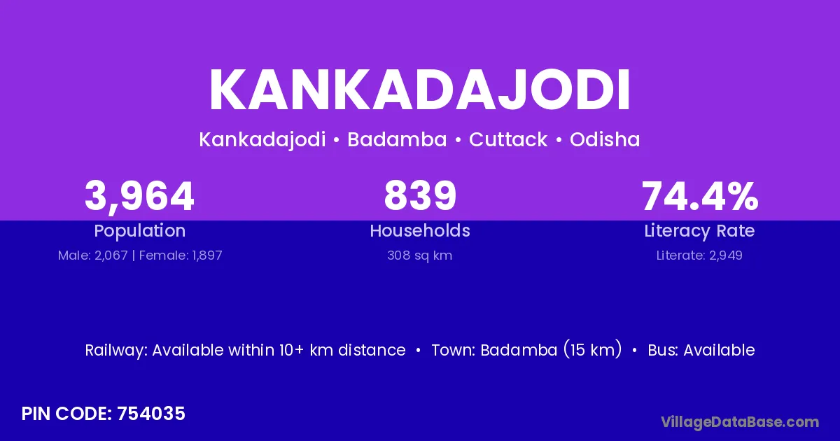 Kankadajodi village has a total population of 3,964 people, of which 2,067 are males and 1,897 are females.