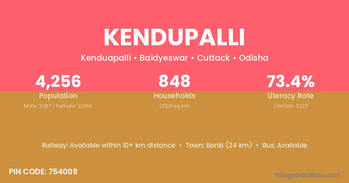 Badamba (25 km) is the nearest town to Kendupalli village for major economic activities and is located approximately 25 km away.