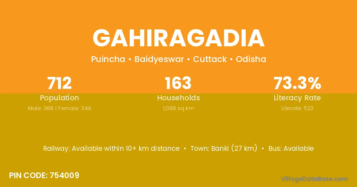 Banki (27 km) is the nearest town to Gahiragadia village for major economic activities and is located approximately 27 km away.