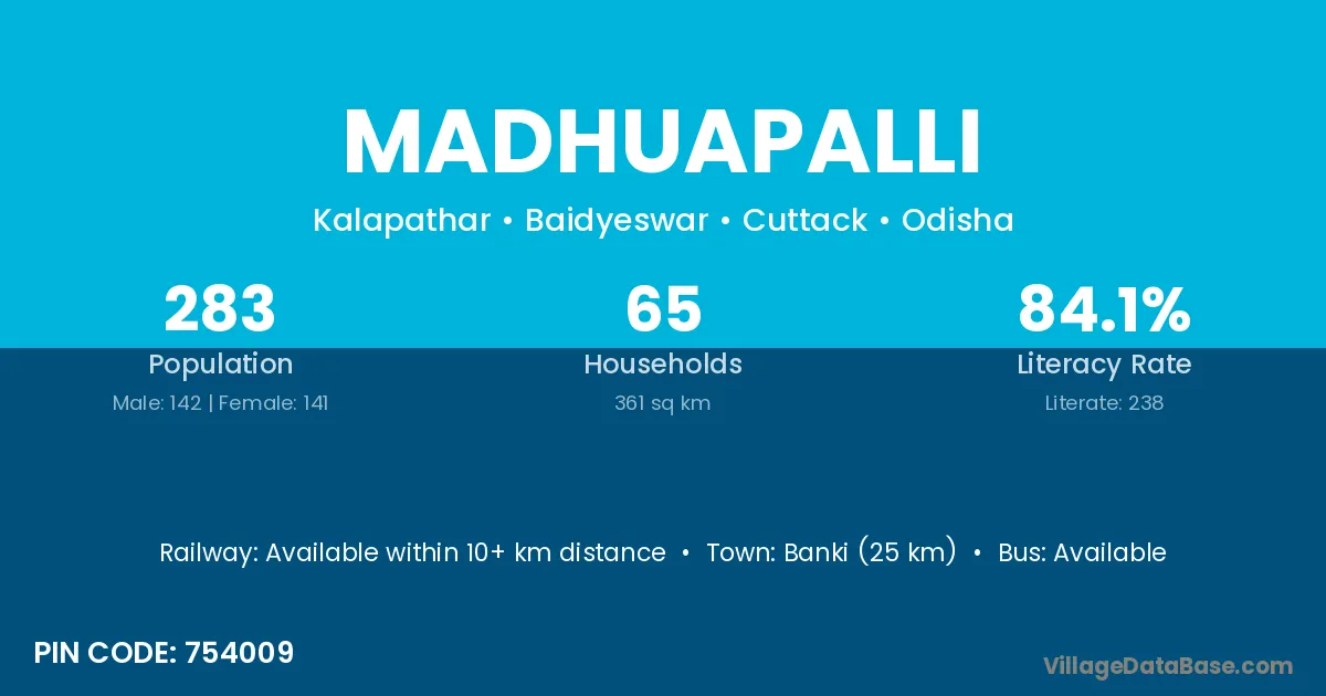 Banki (25 km) is the nearest town to Madhuapalli village for major economic activities and is located approximately 25 km away.