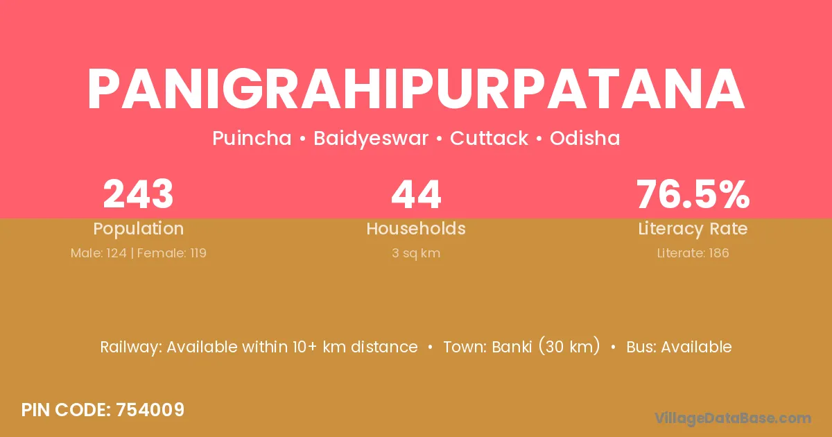 Panigrahipurpatana village has a total population of 243 people, of which 124 are males and 119 are females.