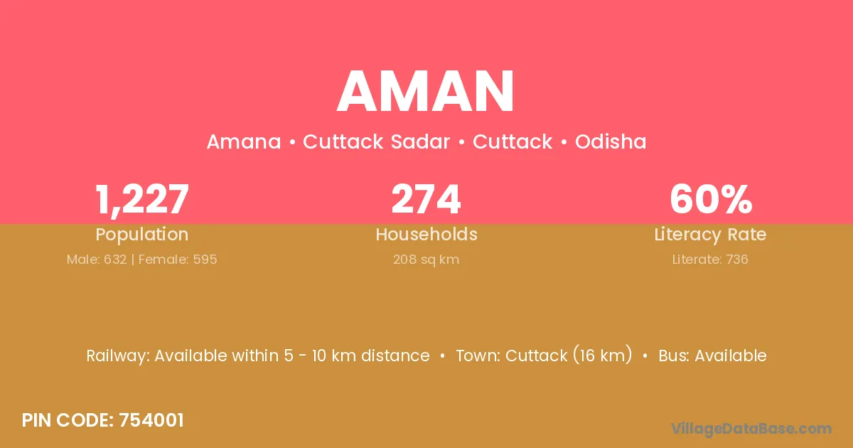 Cuttack (16 km) is the nearest town to Aman village for major economic activities and is located approximately 16 km away.