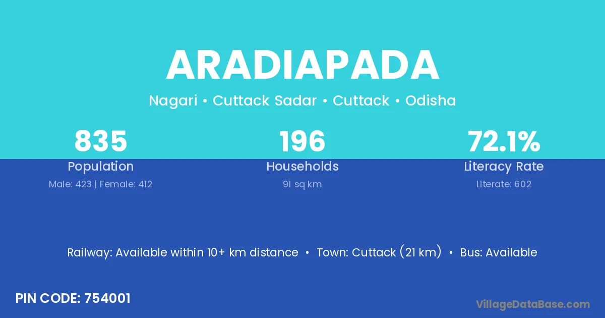 Cuttack (21 km) is the nearest town to Aradiapada village for major economic activities and is located approximately 21 km away.