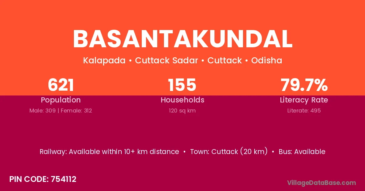 Cuttack (20 km) is the nearest town to Basantakundal village for major economic activities and is located approximately 20 km away.
