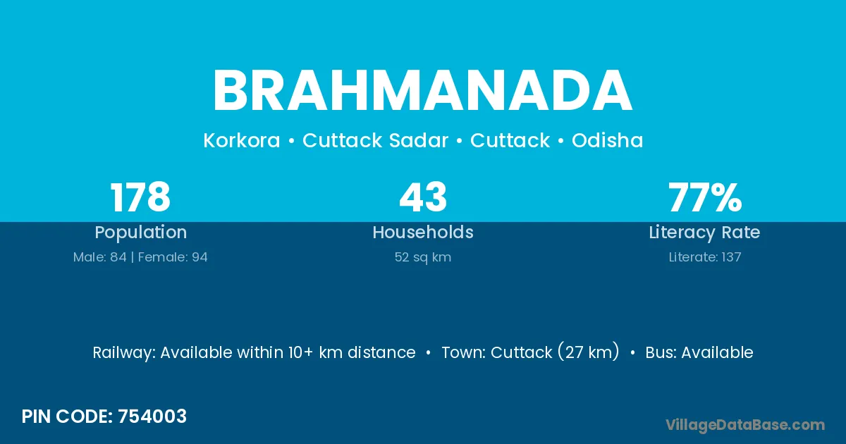 Cuttack (27 km) is the nearest town to Brahmanada village for major economic activities and is located approximately 27 km away.