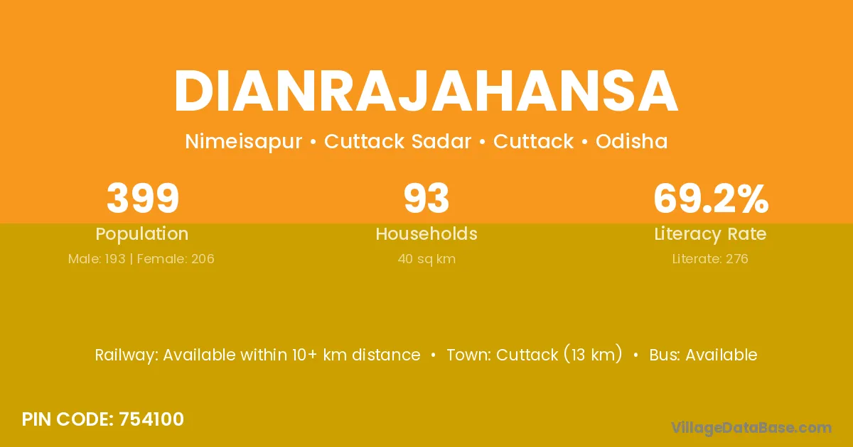 Cuttack (13 km) is the nearest town to Dianrajahansa village for major economic activities and is located approximately 13 km away.
