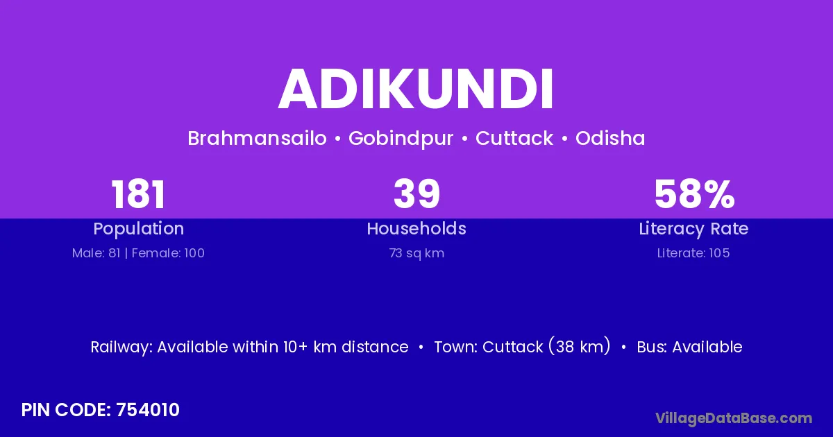 Cuttack (38 km) is the nearest town to Adikundi village for major economic activities and is located approximately 38 km away.