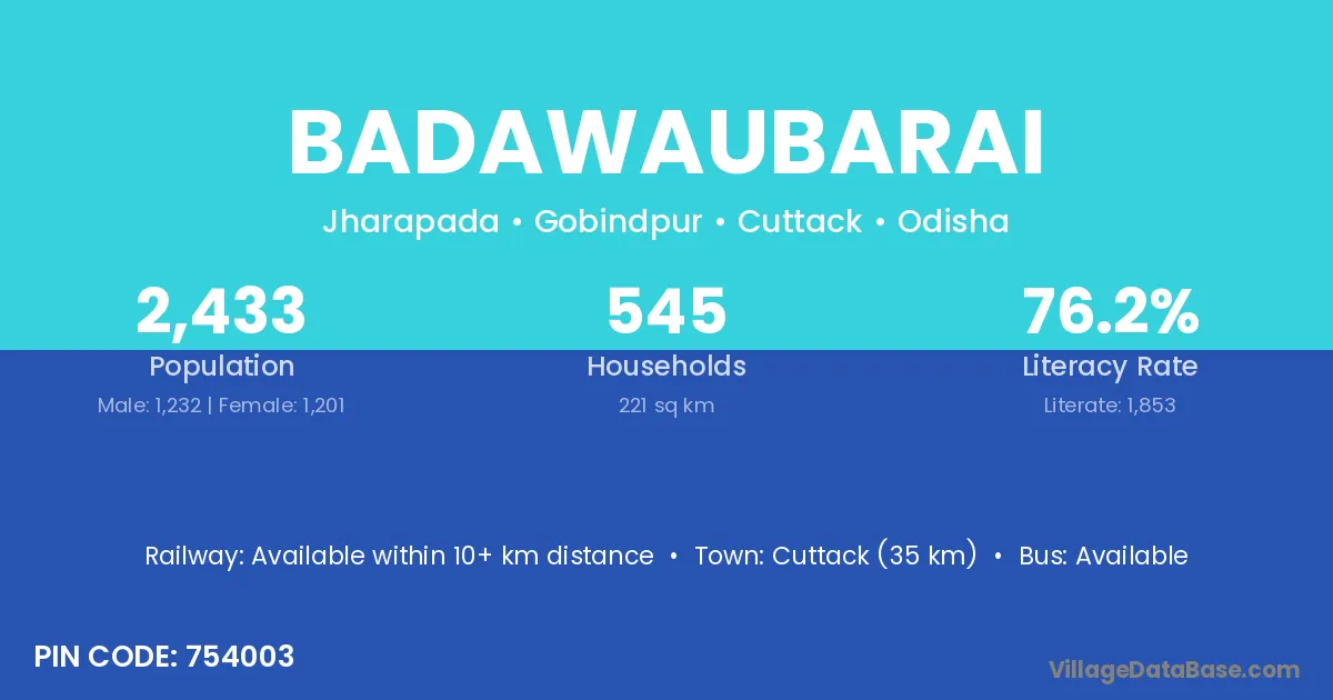 Cuttack (35 km) is the nearest town to Badawaubarai village for major economic activities and is located approximately 35 km away.