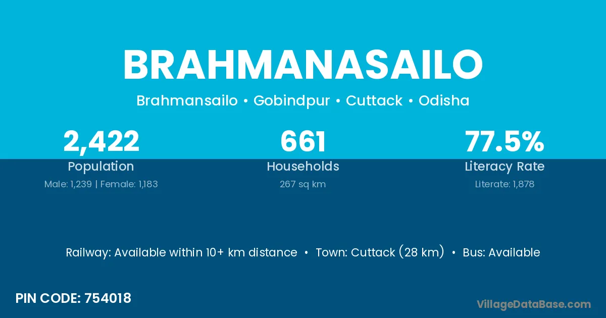 Brahmanasailo village has a total population of 2,422 people, of which 1,239 are males and 1,183 are females.