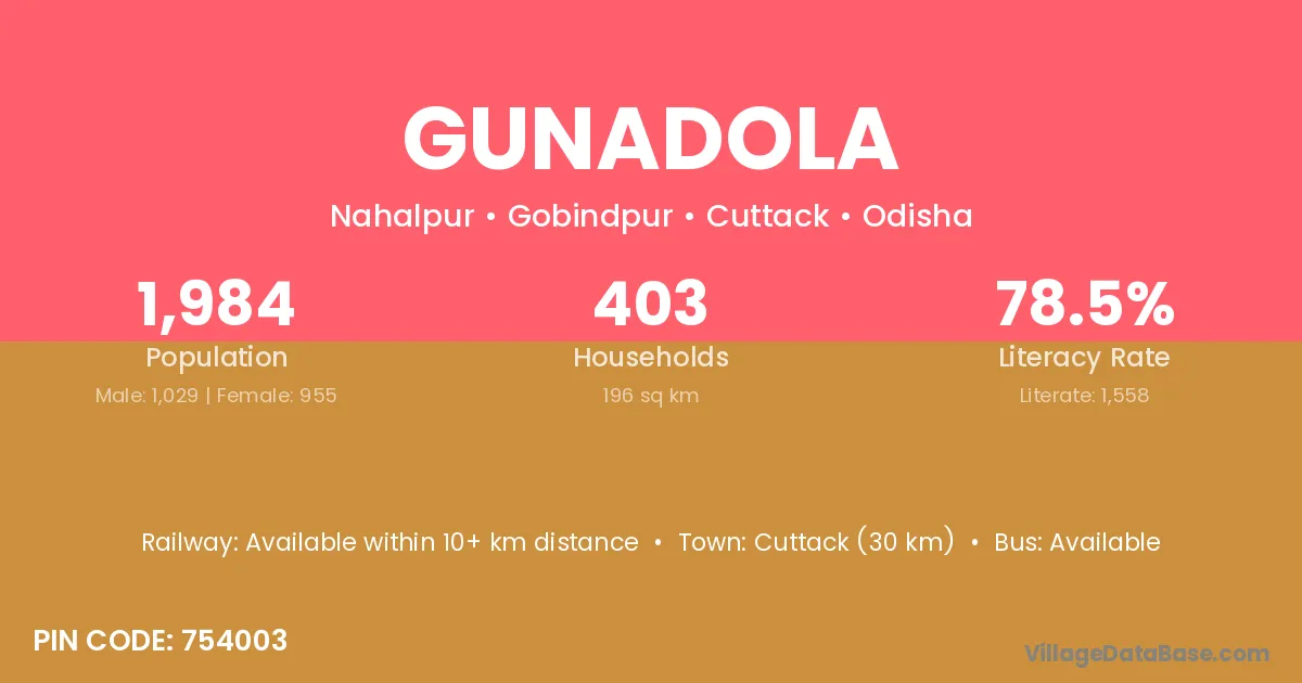 Cuttack (30 km) is the nearest town to Gunadola village for major economic activities and is located approximately 30 km away.