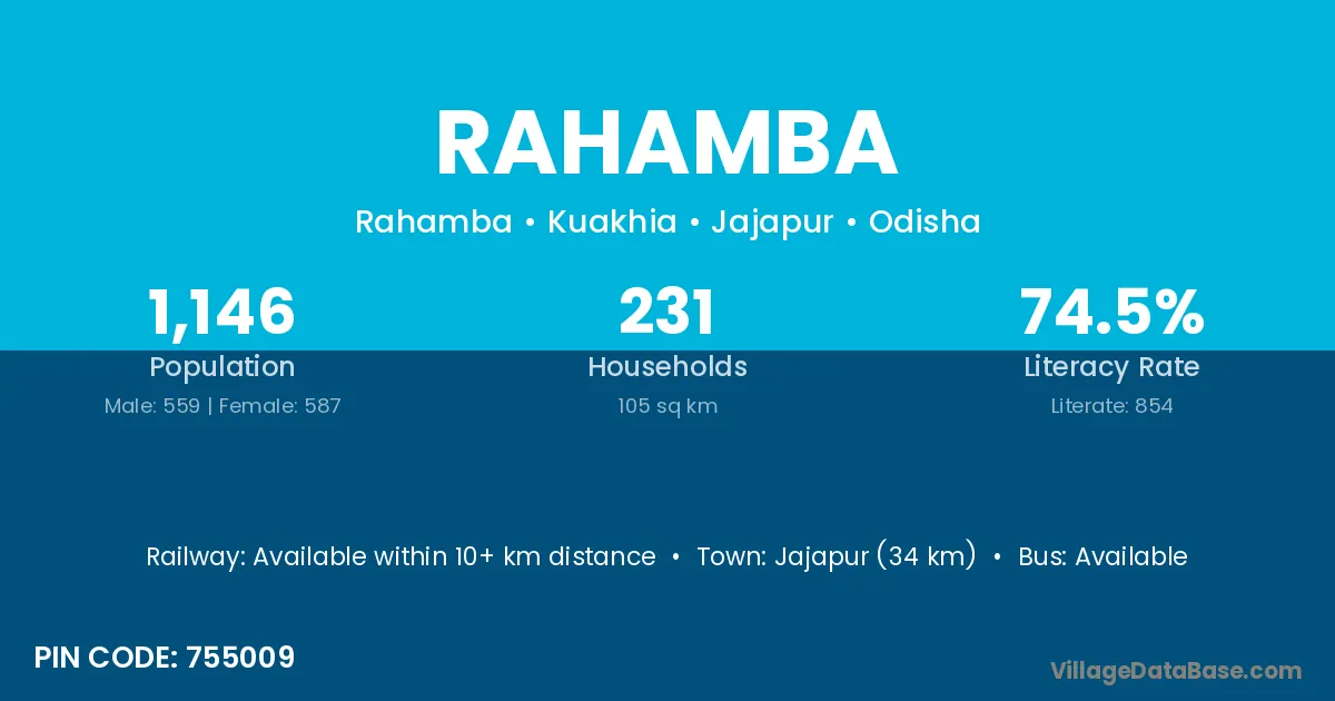 Cuttack (50 km) is the nearest town to Rahamba village for major economic activities and is located approximately 50 km away.