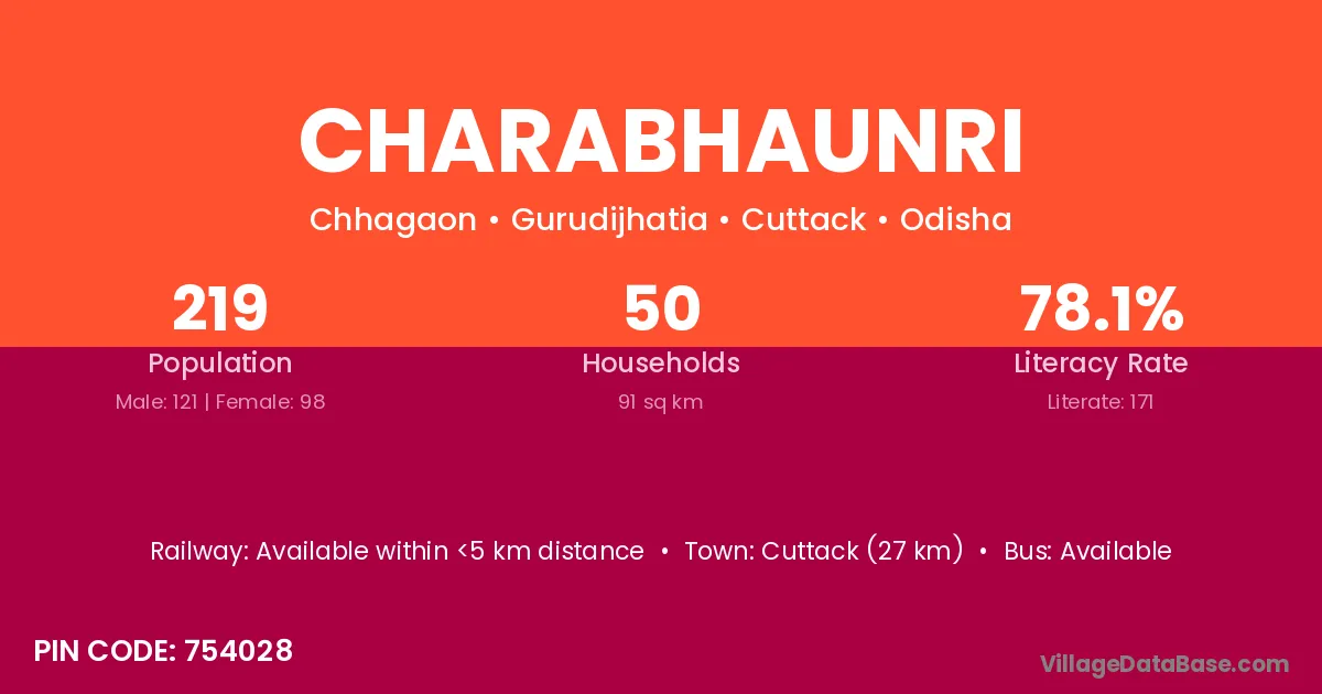 Cuttack (27 km) is the nearest town to Charabhaunri village for major economic activities and is located approximately 27 km away.