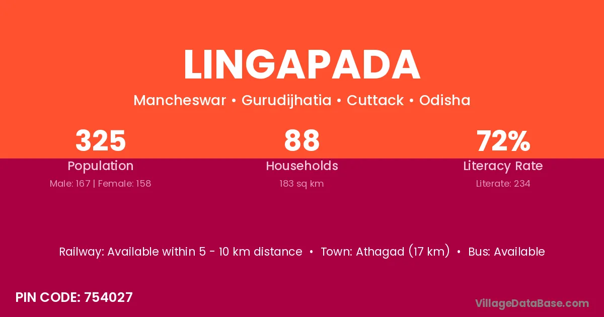 Athagad (17 km) is the nearest town to Lingapada village for major economic activities and is located approximately 17 km away.