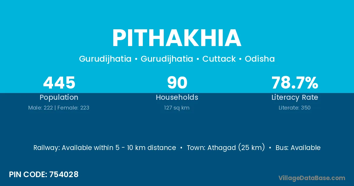 Athagad (25 km) is the nearest town to Pithakhia village for major economic activities and is located approximately 25 km away.