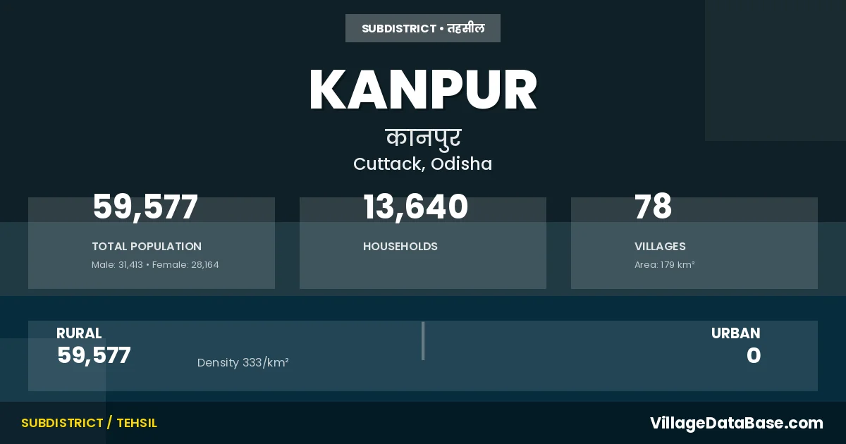 Kanpur is a town and Tehsil in the Cuttack district of the Odisha. In India, a Tehsil is a subdivision of a district responsible for the administration and revenue collection of a specific area within the district. Tehsils play a crucial role in the local governance structure, contributing significantly to the development and administration of their communities.