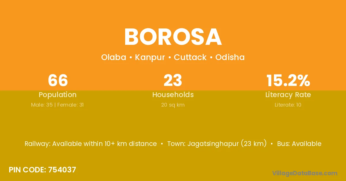 Jagatsinghapur (23 km) is the nearest town to Borosa village for major economic activities and is located approximately 23 km away.