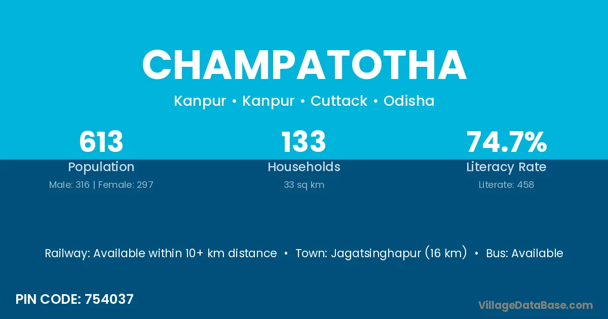 Jagatsinghapur (16 km) is the nearest town to Champatotha village for major economic activities and is located approximately 16 km away.