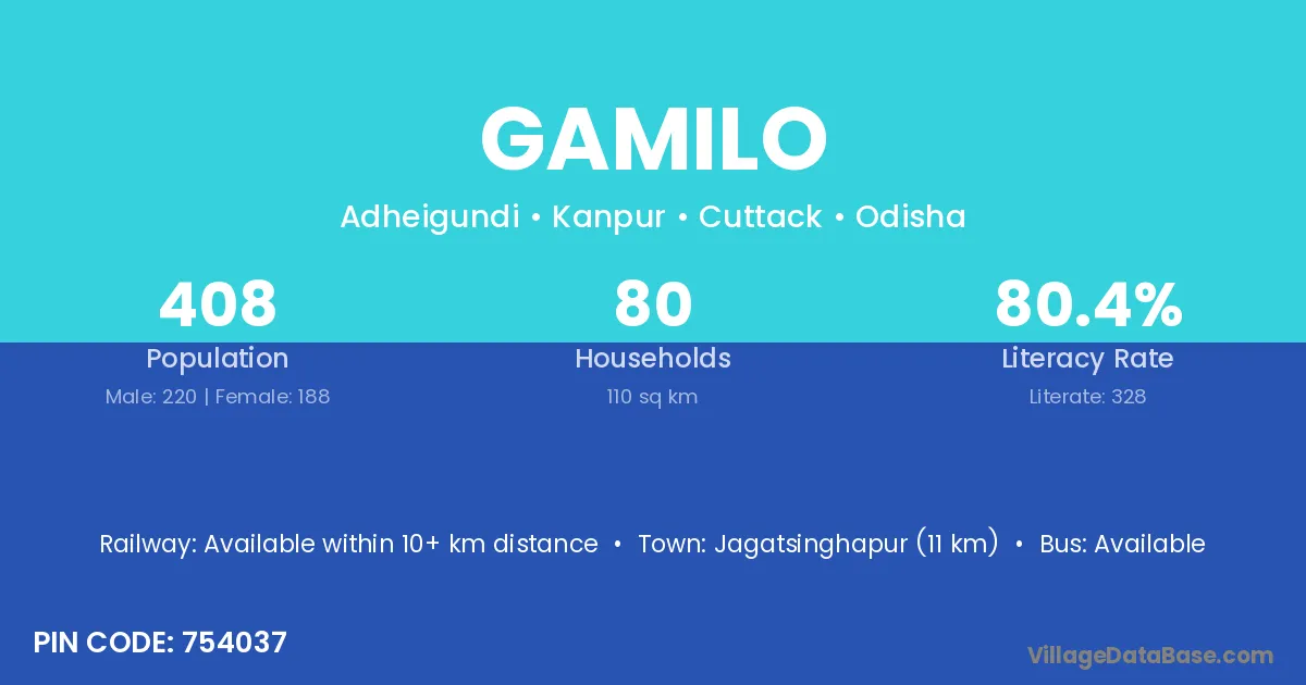 Jagatsinghapur (11 km) is the nearest town to Gamilo village for major economic activities and is located approximately 11 km away.